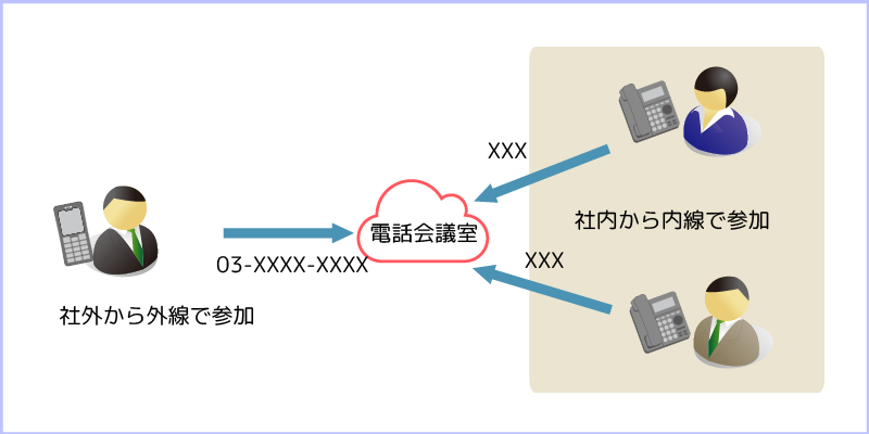 最大5人まで簡単に電話会議を設定出来ます。 会議室に内線番号、外線番号を設定して、社内はもちろん社外からも電話会議システムを手軽に利用出来ます。 5名以上の会議室はお問い合わせください。