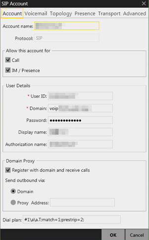 ◆アカウントの設定:ソフトフォンの設定画面で以下をご入力ください。